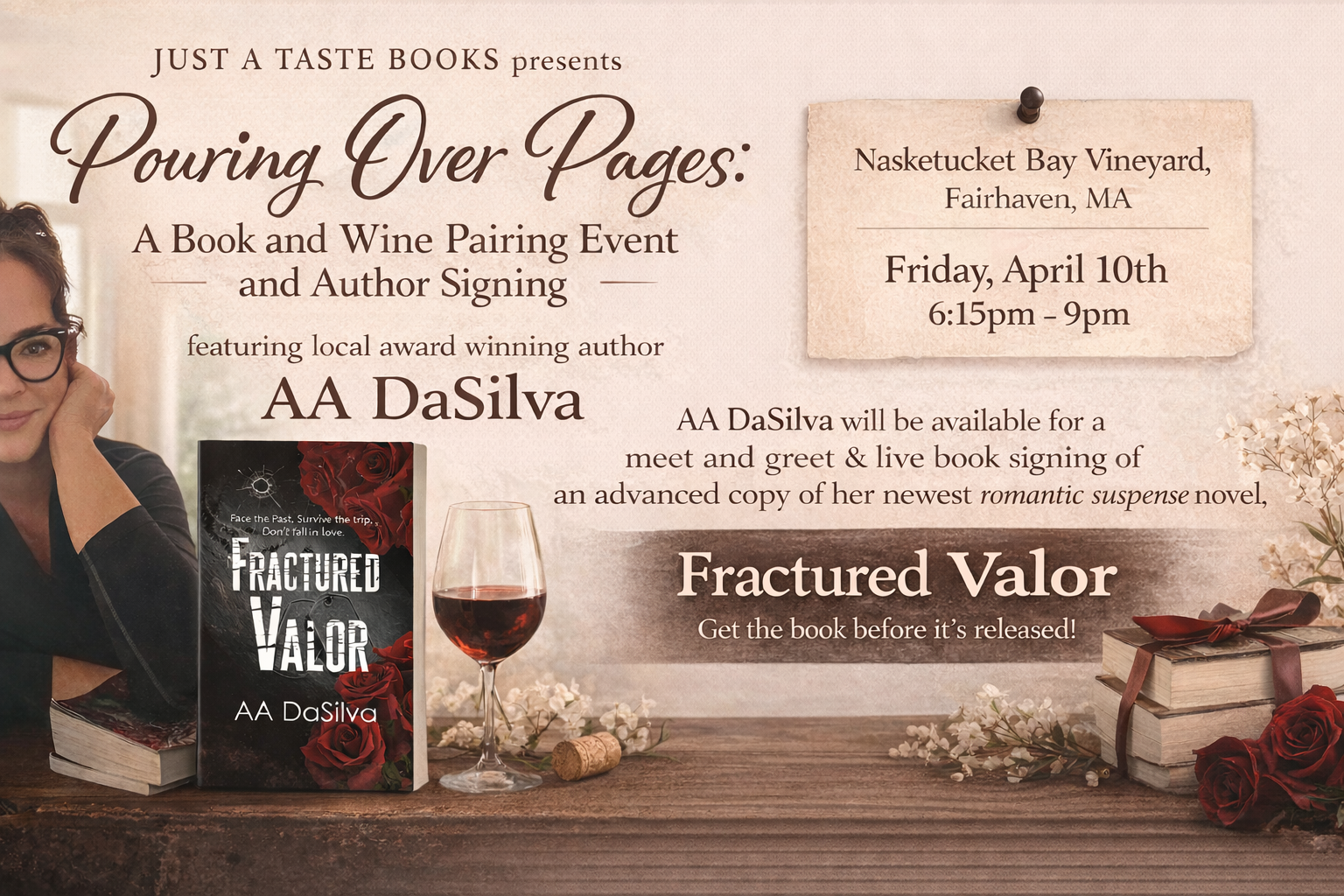 - April 10, 2026: Just a Taste Books Presents: Pouring Over Pages – A Book and Wine Pairing Event. Live signing. Free Swag. Games. Prizes. Food. Join us for an unforgettable evening at the Nasketucket Bay Vineyard in Fairhaven, MA! Purchase your tickets now before they sell out!