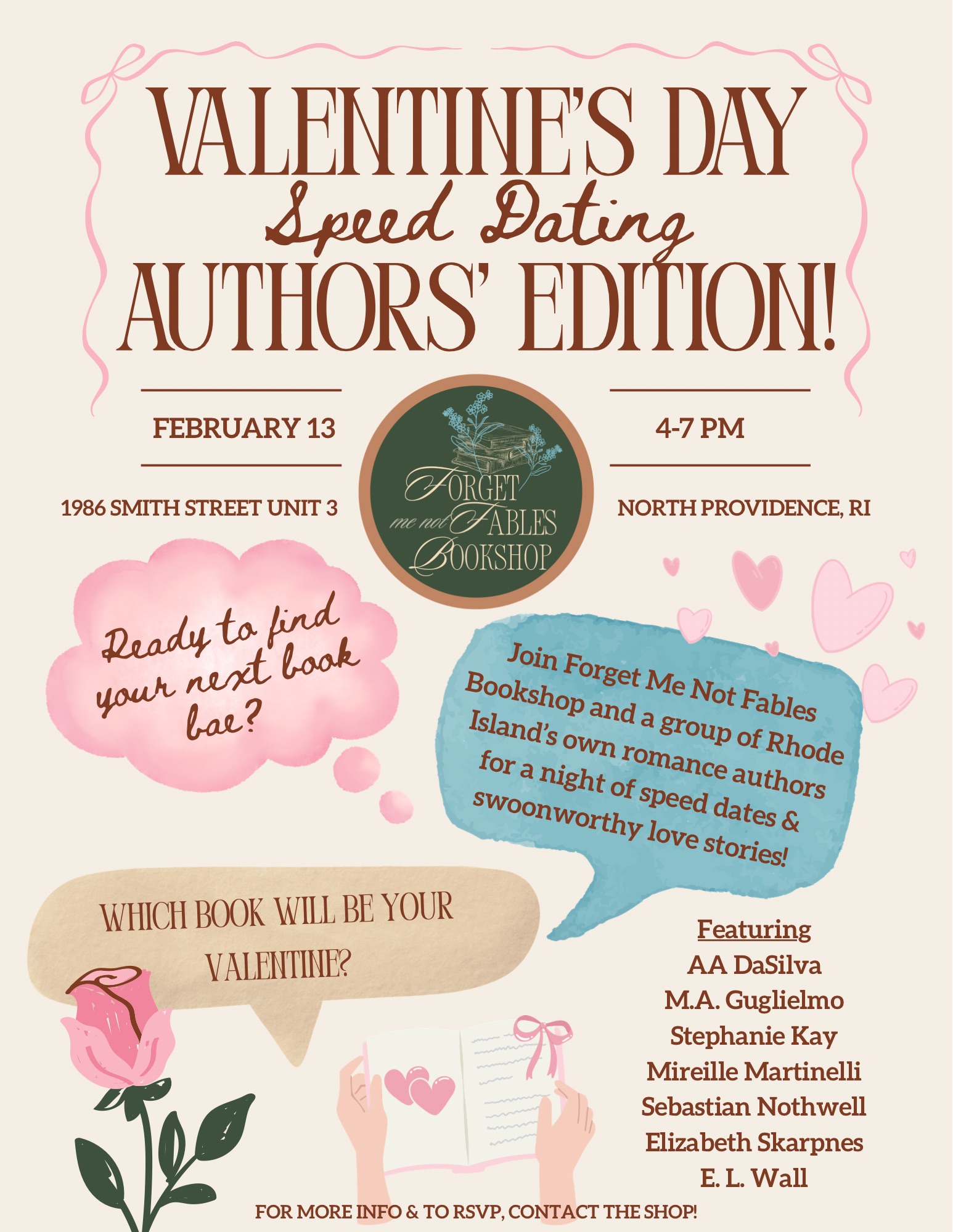 - February 13, 2026 4 p.m. – 7 p.m. Forget Me Not Fables | N. Providence, RI: Author meet & Greet: Speed Dating Edition (To find your next book boyfriend!)
