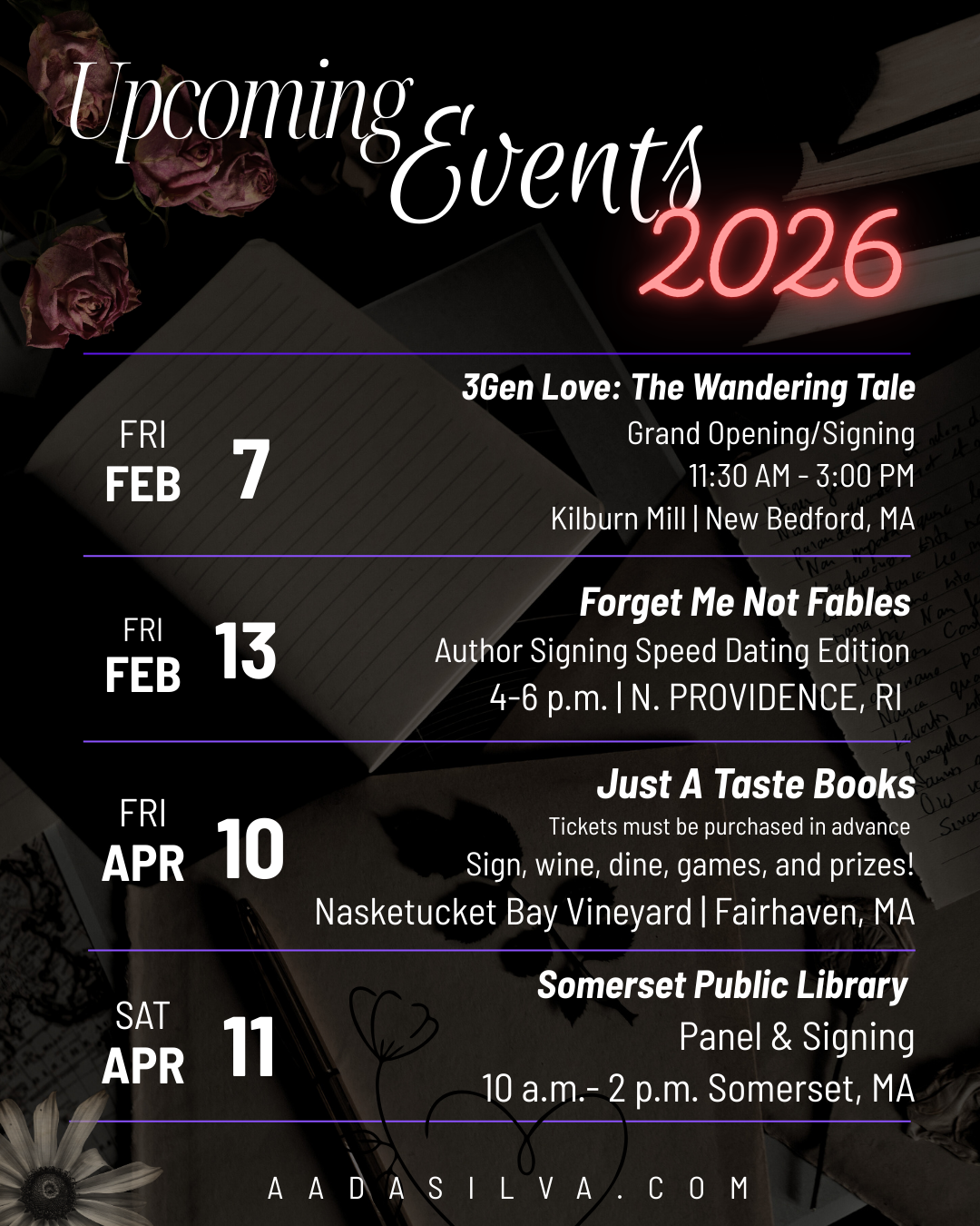 - February 7, 2026 11:30-3:00 p.m. 3GenLove: The Wandering Tale grand opening event & book signing. Kilburn Mill, New Bedford, MA